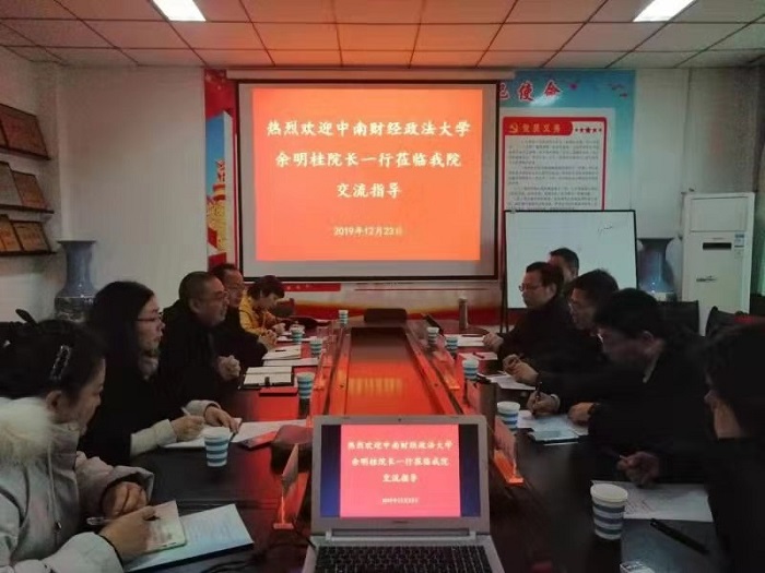 2019年12月23日上午,中南财经政法大学金融学院一行,在院长余明桂带带领下,到我校日本精品一区二区商谈深度合作事宜。并在日本精品一区二区会议室召开工作推进会议,院长黄良杰,副院长邵翠丽、贾宪军、王培玲、牧业金融研究院副院长宋晓薇参加了会议。会议由日本精品一区二区副院长贾宪军主持。