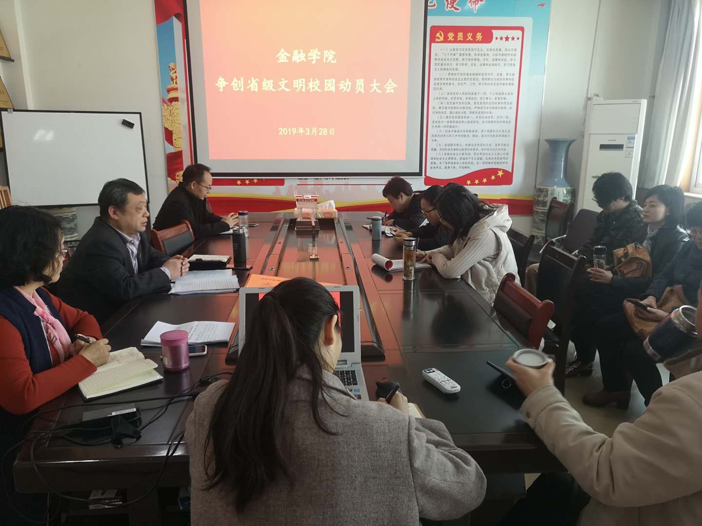 为进一步推动学校精神文明建设,落实校党委提出的创建工作目标任务。3月28日下午,金融学院召开争创省级文明校园动员大会。全院教工参加大会,党总支书记胡红林主持会议。