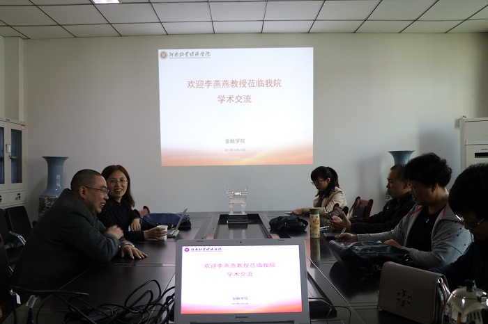 报告结束后,李燕燕教授前往金融学院会议室与我院部分教师进行了科研与学术交流,副校长许圣道应邀出席了本次活动。李教授首先结合自身数次成功获取国家级课题立项的经验谈起,从课题研究方向、选题、申报表的填写等方面给大家做了一个深入细致的指导。其次,对于论文的写作以及社会调研也给出了具体性的建议。最后,李教授对我院老师的提问进行了详细的解答。