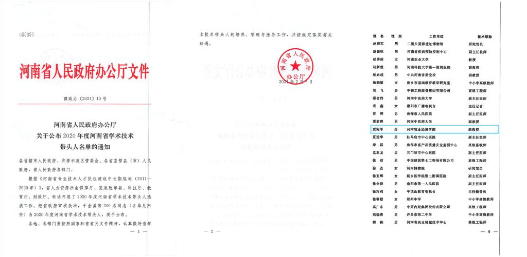 近日,河南省人民政府办公厅发布了豫政办〔2021〕10号文件,正式公布了2020年度“河南省学术技术带头人”名单,我院副院长贾宪军博士荣获“2020年度河南省学术技术带头人”荣誉称号。