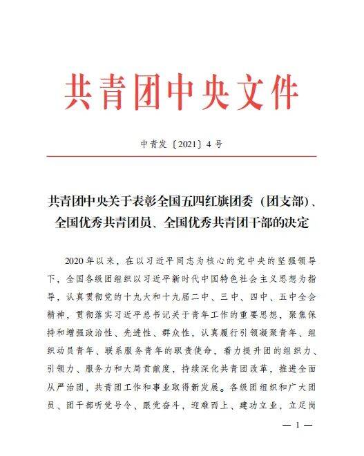 在迎接建党100周年之际,由共青团中央传来喜讯,在公布的《关于表彰全国五四红旗团委 (团支部)、全国优秀共青团员、 全国优秀共青团干部的决定》(中青发〔2021〕4号),日本精品一区二区被授予“全国五四红旗团总支”荣誉称号,这是共青团中央授予基层团组织的最高荣誉,也是我院团委继2016年获得河南省“五四红旗团总支”荣誉之后的又一次突破。