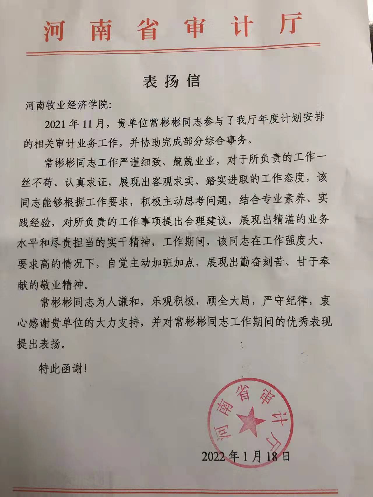 近日,我院收到河南省审计厅发来的表扬信,信中对我院借调审计厅的常彬彬老师在年度相关审计业务工作中做出的贡献给予了充分的肯定。
