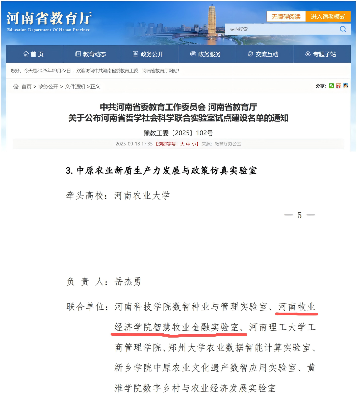 近日,中共河南省委教育工作委员会、河南省教育厅公布了首批河南省哲学社会科学联合实验室试点建设名单。由我校作为主要协同单位联合申报的“中原农业新质生产力发展与政策仿真实验室”成功入选。