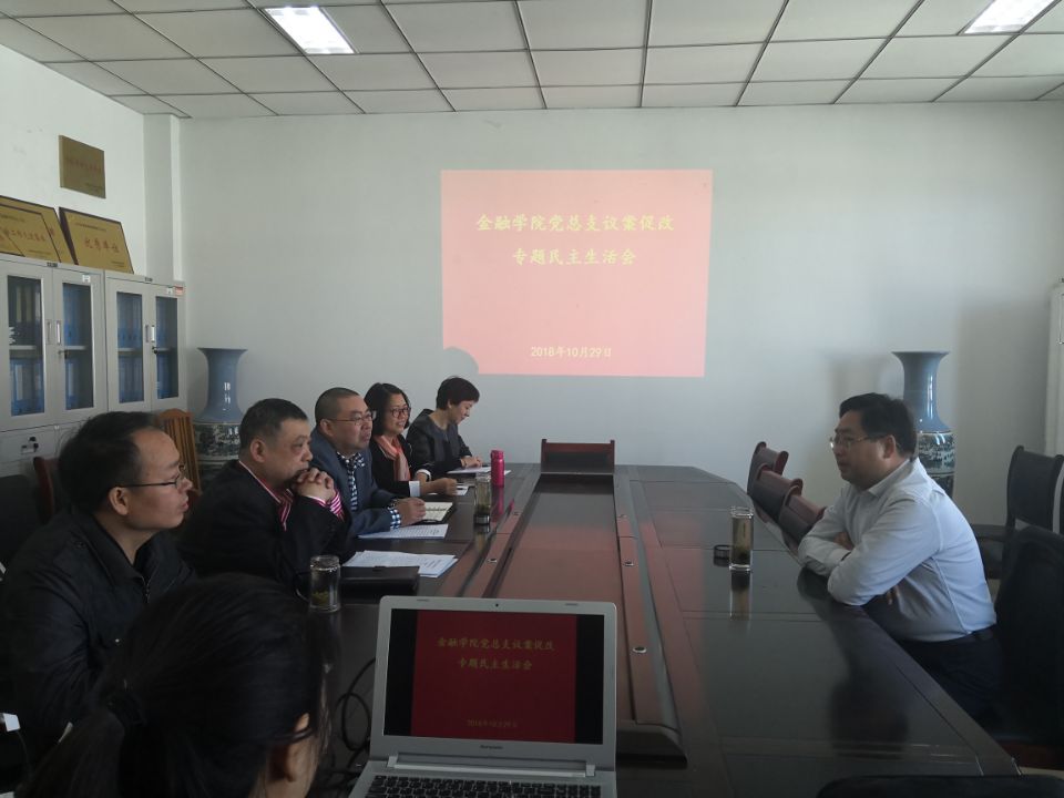 根据学校《关于召开处级党员领导干部以案促改民主生活会的通知》的文件要求,10月29日上午10:00,金融学院党总支在金融学院会议室召开了以案促改专题民主生活会。金融学院党总支书记胡红林、院长黄良杰、正处级组织员赵桂珍、副书记兼副院长贾宪军、副院长王培玲参加会议,党总支委员李特列席会议,会议由胡红林主持。校长罗士喜参加了本次专题民主生活。