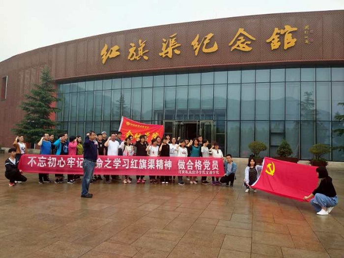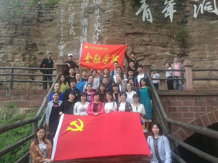 为进一步深入学习贯彻落实党的十九大精神和习近平新时代中国特色社会主义思想,加强党员教育,提升党性修养,持续提升党建工作水平,进一步深化“两学一做”学习教育,教育引导广大党员坚定理想信念,经校党委组织部同意,金融学院党总支组织教工党员和部分在校学生党员,在党总支书记胡红林和院长黄良杰的带领下,于5月18日至19日赴林州市红旗渠开展“不忘初心牢记使命之学习红旗渠精神,做合格党员”主题党日活动。