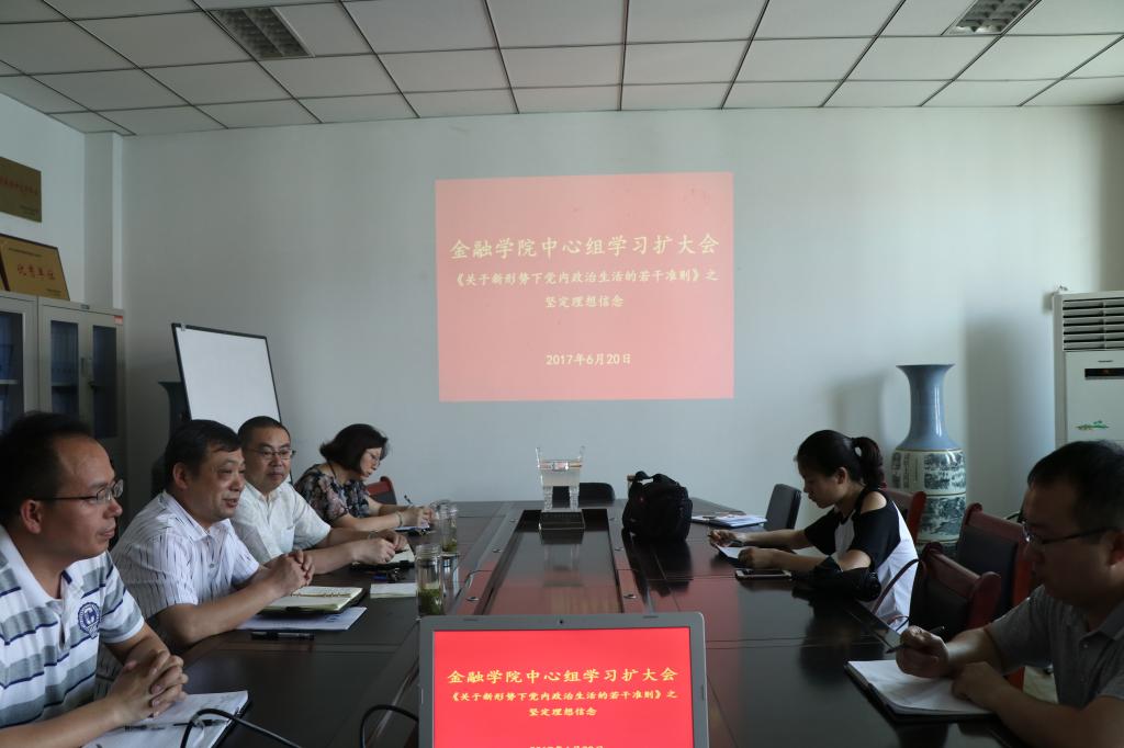 6月20日下午,金融学院召开中心组学习扩大会议,专题学习《关于新形势下党内政治生活的若干准则》之坚定理想信念,金融学院党总支委员参加了会议,会议由党总支书记胡红林主持。