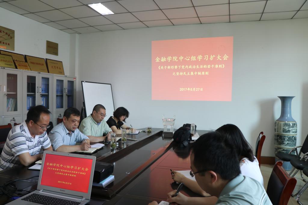 5月27日上午,金融学院召开中心组学习扩大会议,专题学习民主集中制,金融学院党总支委员参加了会议,会议由党总支书记胡红林主持。