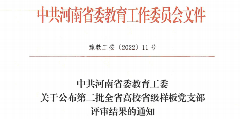 2022年3月16日,中共河南省委教育工作委员会发布《关于公布第二批全省高校省级样板党支部评审结果的通知》(豫教工委[2022]11号),经过学校推荐、专家评审、综合考评,并经省级样板党支部评定领导小组研究,确定我校日本精品一区二区教工第一党支部为省级样板党支部。
