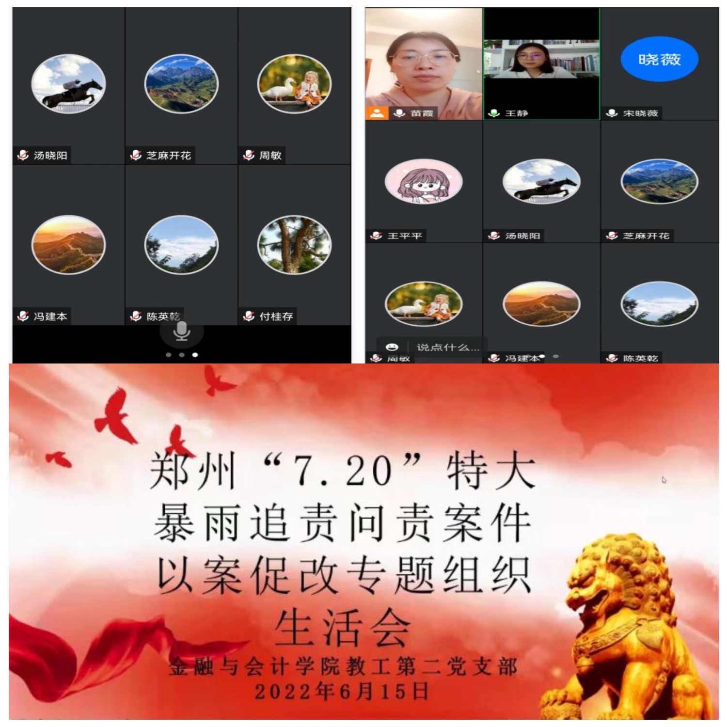2022年6月15日下午,日本精品一区二区教工第二党支部召开“7·20”特大暴雨灾害追责问责案件以案促改专题组织生活会。日本精品一区二区第二党支部的党员同志参加会议并展开了热烈地讨论交流,会议由党支部书记宋晓薇主持,通过腾讯会议的形式进行。