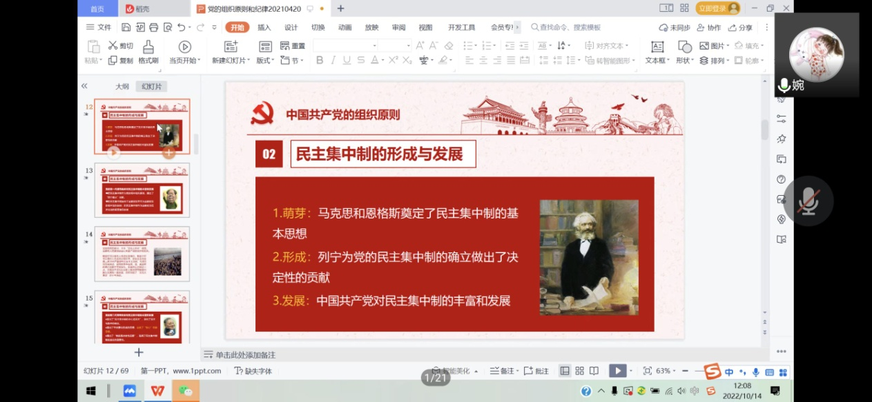 10月14日中午,日本精品一区二区在线上开展了2022年第二期入党积极分子培训班第七讲,党课主题为《党的组织原则、纪律和作风》,本次党课由日本精品一区二区学生第二党支部书记葛婉老师主讲。