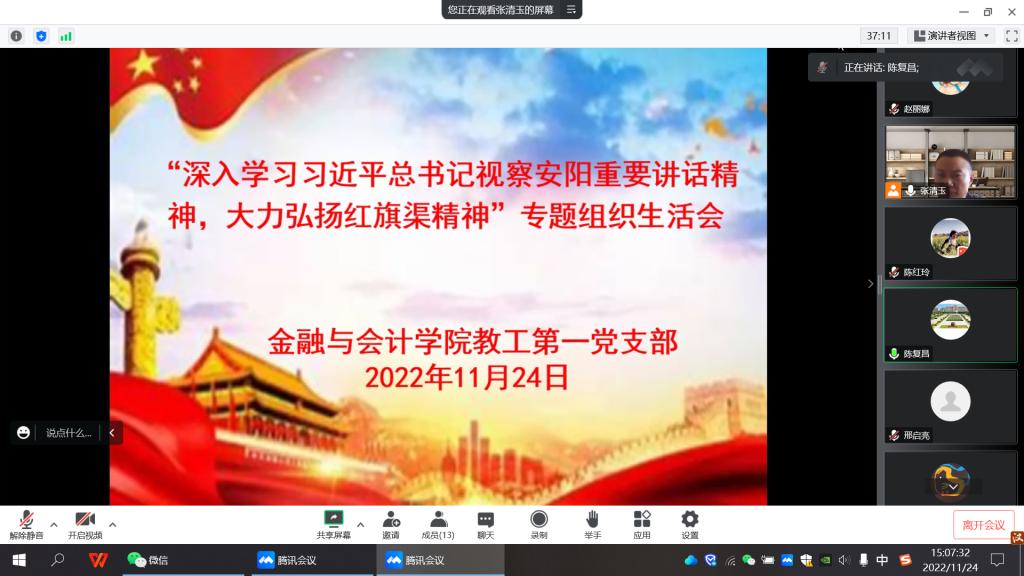 2022年11月24日下午,日本精品一区二区教工第一党支部召开“深入学习习近平总书记视察安阳重要讲话精神,大力弘扬红旗渠精神”专题组织生活会。会议由党支部书记张清玉同志主持,支部全体党员参加会议,校纪委副书记杨成同志及校纪委副科级纪检监察员张馨亓同志列席会议。