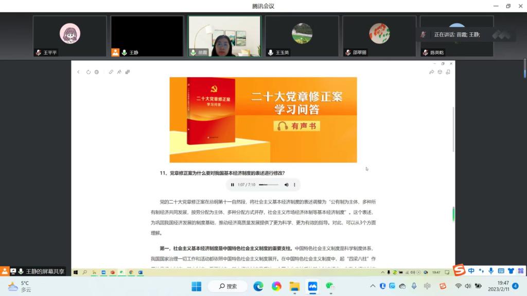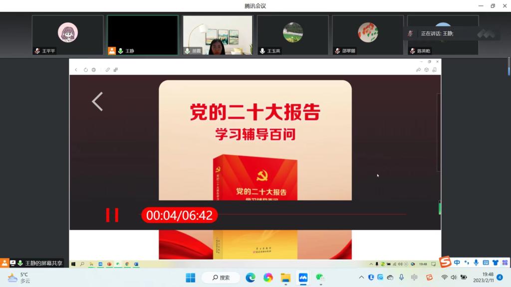 支部书记苗霞介绍了本次会议学习的重点和重要意义,带领大家对《党的二十大报告学习辅导百问》有声书中部分精神内涵进行了集体学习,简要概述了党章修改的主要内容和环节。并结合个人工作实际与大家分享如何理解和落实党的二十大精神内涵,如何从党的二十大报告中提取课程思政养分,丰富课堂内容,引领正确意识形态。支部党员纷纷结合个人工作实际就国家重大决定和重要会议的战略意义、党章修正重大意义、科技强国与教育创新等精神内涵发表个人看法,开展集体研讨。结合学习心得,王玉英、苏欣、王静、陈英乾等支部全体党员同志从工作责任心、集体荣誉感、信息时代教师教学工作创新、科学研究能力提升等视角,对照党员义务,党员政治信仰和党员意识、理论学习、能力本领和作用发挥、纪律作风等方面开展批评与自我批评,查摆问题,明确努力方向。