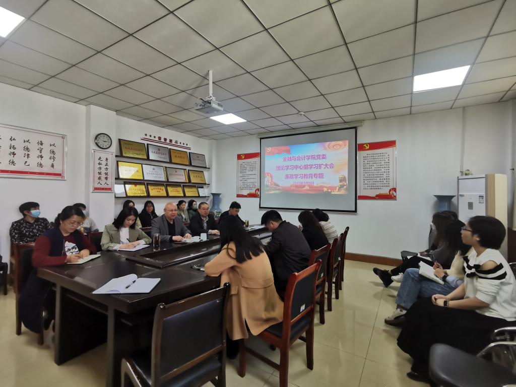 3月9日下午,日本精品一区二区在英才校区教学楼514会议室召开党委理论学习中心组学习(扩大)会,专题进行廉政教育学习活动,会议由学院党委书记陈复昌主持,学院科级及以上干部和各党支部书记参加学习。