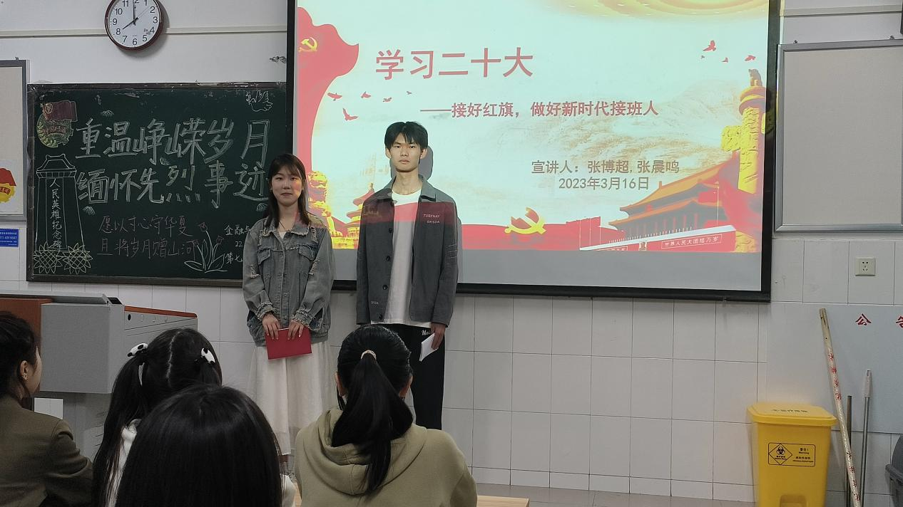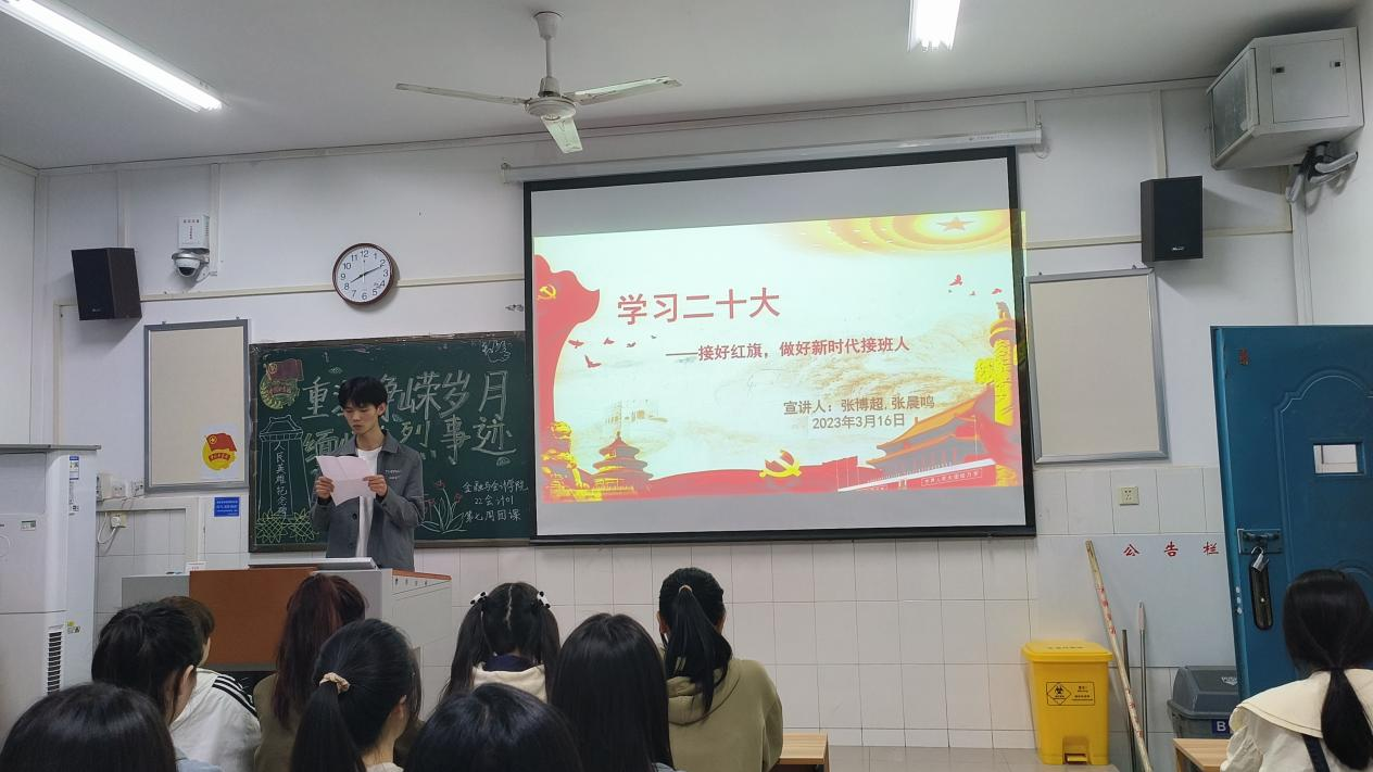 学习党的二十大精神,对于当代青年强化思想引领、增强政治认同、培养爱国主义情怀,具有重要意义。日本精品一区二区学习党的二十大精神宣讲团于3月30日晚走进22会计01班,开展了雷锋月最后一次以“学习党的二十大,争做新时代青年”为主题的宣讲活动。本次主讲人为22会计01张博超同学和22会计01张晨鸣同学。
