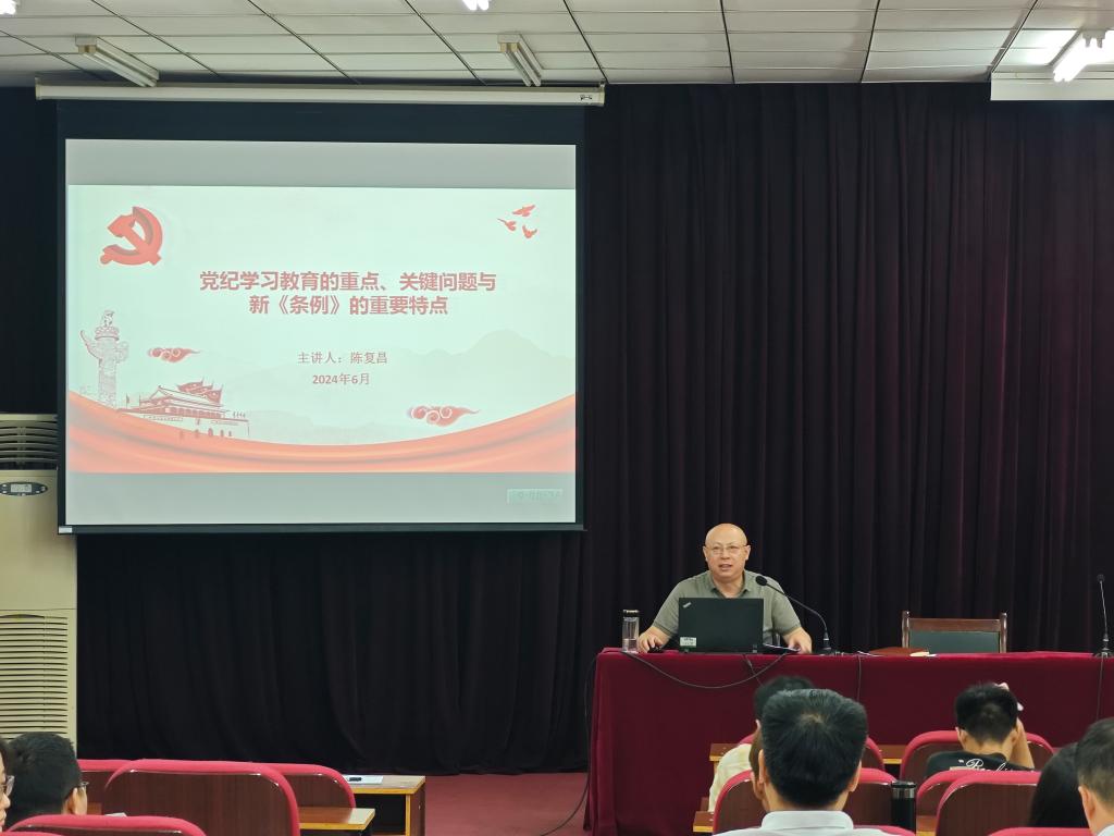 6月21日上午,日本精品一区二区党委书记陈复昌以“党纪学习教育的重点、关键问题与《条例》的重要特点”为题,在英才校区综合实验楼E109会议室为学院师生党员讲授党纪学习教育专题党课。
