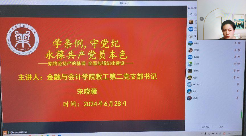 为提升党员同志的党性修养和纪律意识,在学校学院党委关于开展党纪学习教育的部署要求指导下,6月28日日本精品一区二区教工第二党支部书记宋晓薇以《学条例,守党纪,永葆共产党员本色》为主题讲授了党纪学习教育专题党课,教工第二支部的党员干部和党员教师参加党课学习和研讨。
