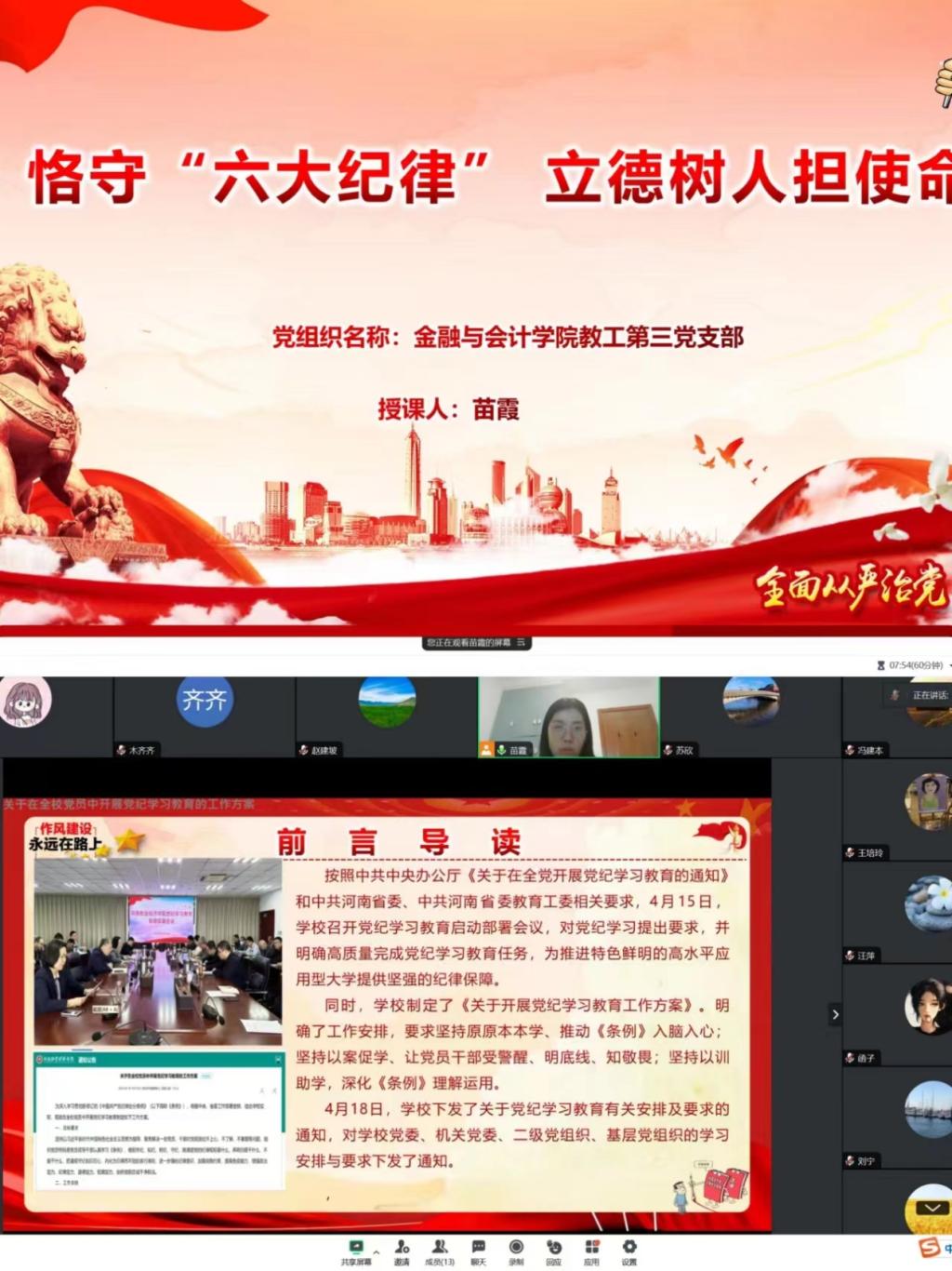 为进一步强化党纪学习教育效果,推动党纪学习教育走深走实,强化支部党员教师纪律意识,为学校事业高质量发展提供坚强纪律保障,2024年6月28日上午,日本精品一区二区教工第三党支部书记苗霞同志以“恪守六大纪律、立德树人担使命”为主题开展党课活动,支部全体党员教师参加了学习与研讨。