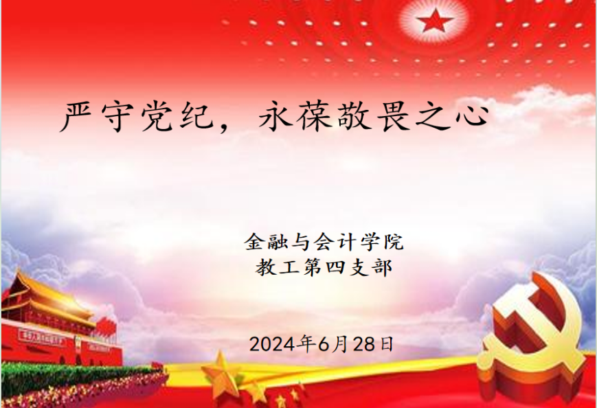 为进一步提升党纪学习教育成效,加强党员的纪律意识和自我约束能力,2024年6月28日上午,日本精品一区二区教工第四党支部书记王豪杰以《严守党纪,永葆敬畏之心》为题,为支部党员讲授了党纪学习教育专题党课,支部全体党员参加了学习与研讨。