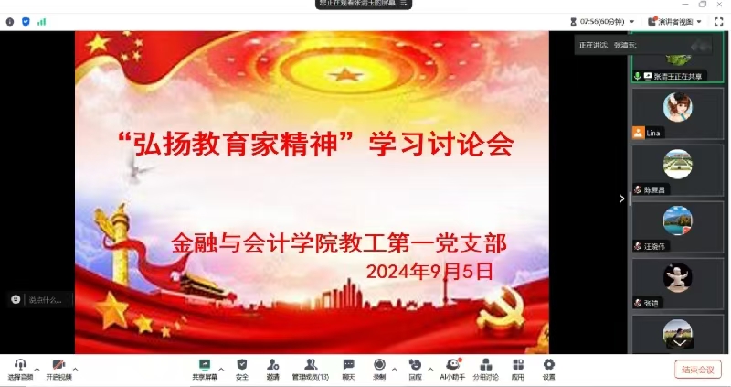 为了大力弘扬教育家精神,加强新时代高素质专业化教师队伍建设,按照学校党委的统一要求,2024年9月5日下午,日本精品一区二区教工第一党支部召开专题学习讨论会,集体学习中共中央、国务院以及学校相关文件精神,研讨如何在日常教育教学中践行教育家精神。会议由支部书记张清玉主持,教工一支部全体党员参加会议。