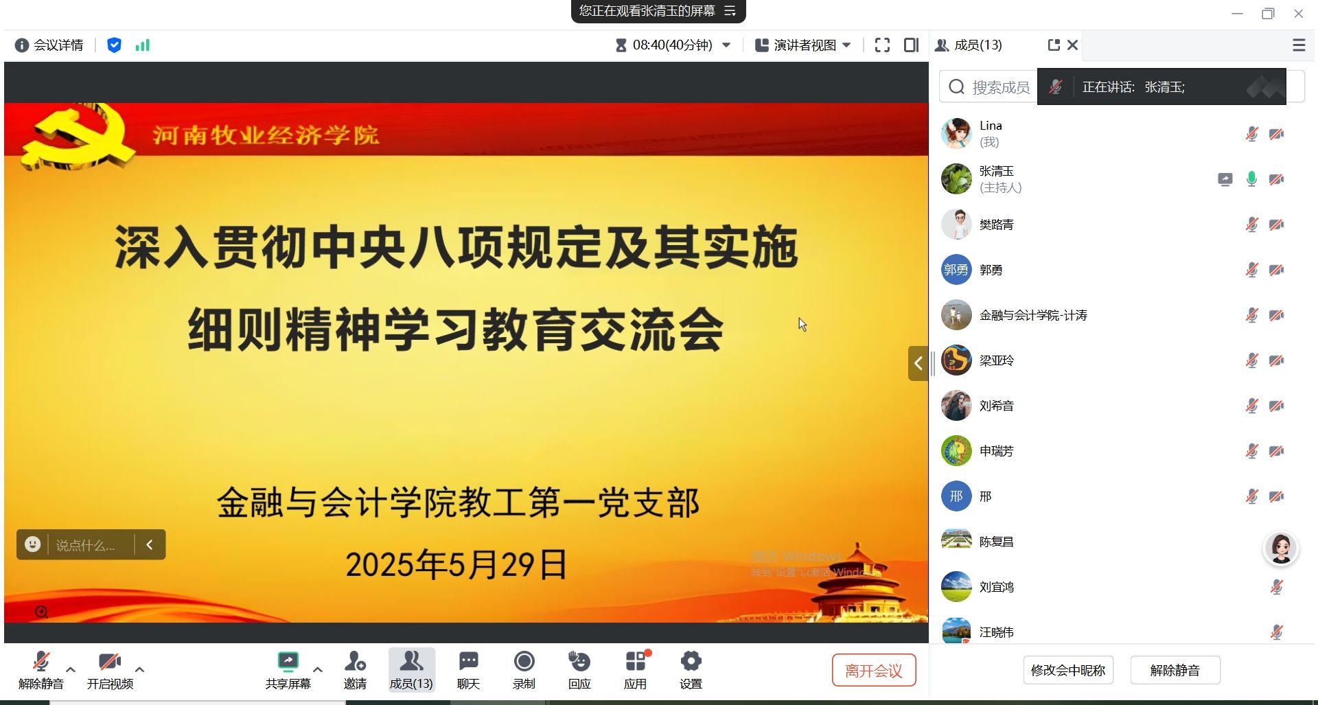 2025年5月29日下午,日本精品一区二区教工第一党支部通过腾讯会议召开关于深入贯彻中央八项规定及其实施细则精神学习教育交流会。本次会议由支部书记张清玉同志主持,教工一支部全体党员参加了会议。