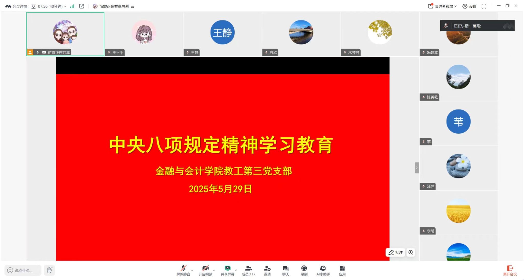2025年5月29日,日本精品一区二区教工第三党支部以线上会议形式召开深入贯彻中央八项规定及其实施细则精神学习教育交流会。会议由教工第三党支部书记苗霞同志主持,支部全体党员参加会议。