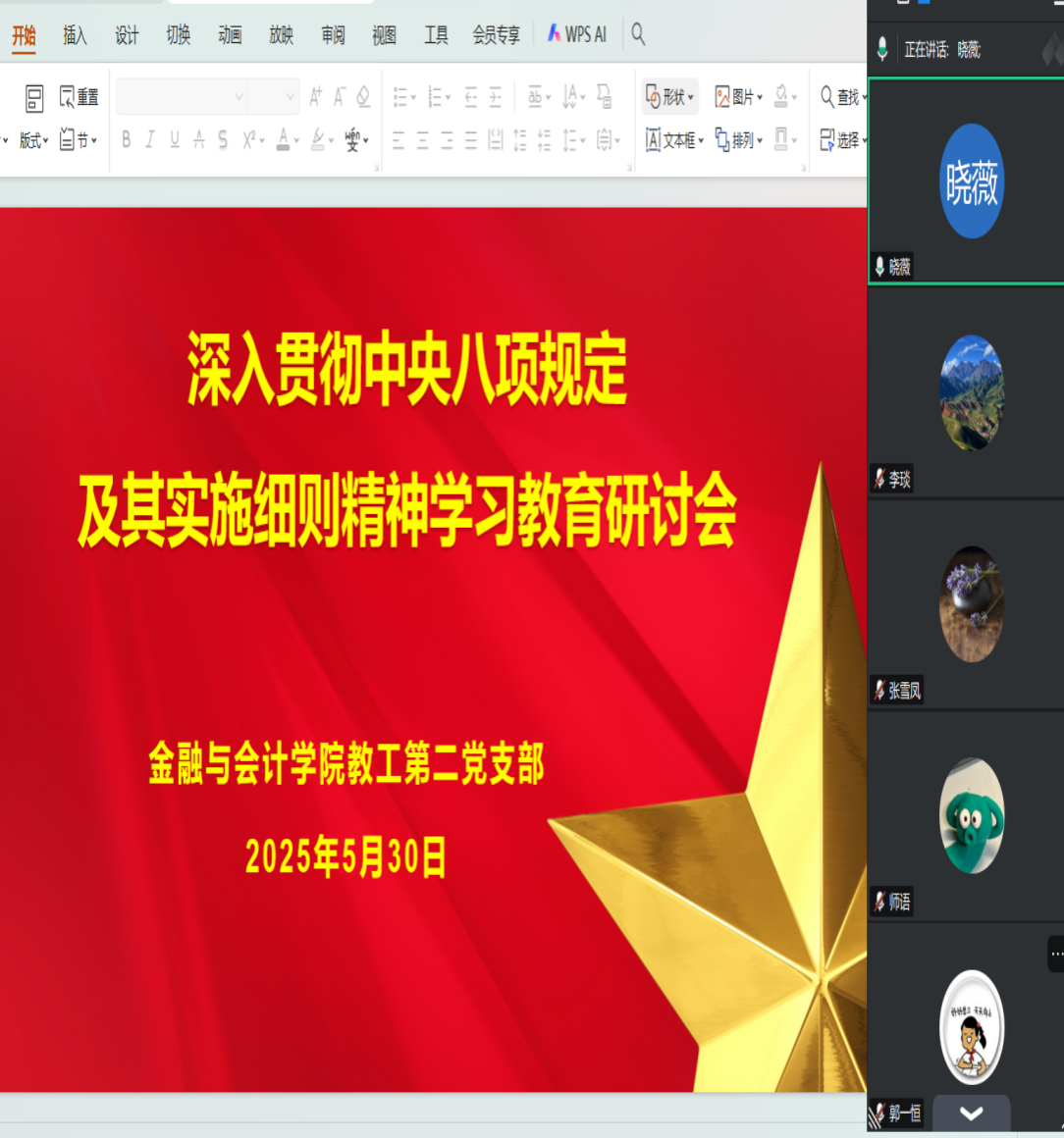 为深入贯彻落实党中央决策部署,深化作风建设,日本精品一区二区教工第二党支部于5月30日组织开展深入贯彻中央八项规定及其实施细则精神学习教育研讨会,本次会议由党支部书记宋晓薇主持,教工二支部党员参加了会议。