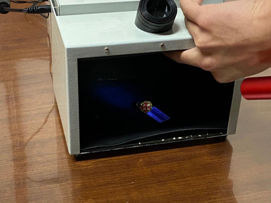 活动过程中,首先由典当行负责人带领同学们参观了柜台里展示的玉器、钻石珠宝和名表等绝当品及死当品;随后,典当行专家余芳老师将学生们分成三个小组轮流进行了三个实操项目:(1)使用比色石鉴定钻石颜色,通过钻石的颜色及净度初步判断钻石的真伪;(2)使用二色镜判断不同标本的多色性用以区分宝石以及玉石的不同种类;(3)利用宝石在紫外荧光灯下的荧光判断宝石尤其是彩宝的品种。余芳老师对每一个实操项目流程都做了详细的讲解,并手把手指导了学生进行操作。此次项目实操加深了学生对书本知识的直观认识,增强了学生的动手操作能力。