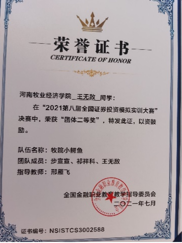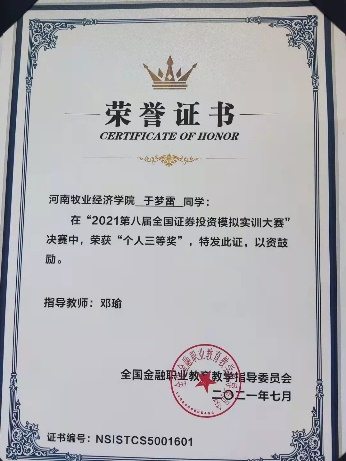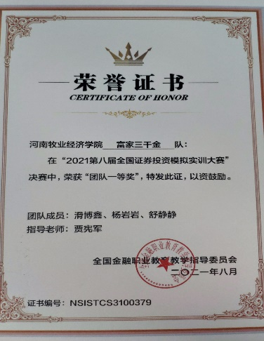 本次大赛共有来自全国589所院校,21046支队伍,65673人参赛。比赛历时3个月,从报名阶段开始院领导就高度重视,副院长贾宪军带队,选拔出186名学生及9名教师,组成52个团队参赛。3个月以来,历经了学生动员培训会、教师多次精心指导、学生不断优化策略、突围区域选拔赛、挺进决赛,最终把握大势、精准交易、强化风险,获得了一个团体一等奖、四个团体二等奖、六个团体三等奖,以及五个个人一等奖和二等奖,创我院参赛以来的最好成绩。