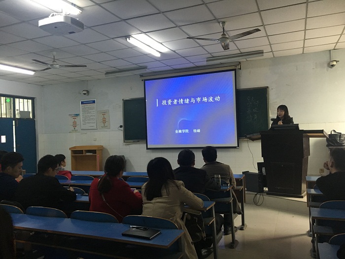 本学期金融学院继续开展院内教师系列讲座活动,为充分调动学生对专业知识学习的积极性,加强学生对金融市场相关知识的了解与投资行为情绪的认知,于11月9日下午,在多媒体教室E103为我院15、16级投资班学生开展“投资者情绪与市场波动”的专题讲座,主讲人为我院杨峰副教授。党总支书记胡红林、副书记贾宪军及部分教师出席并认真听取了本次讲座。本次讲座由副书记贾宪军主持。