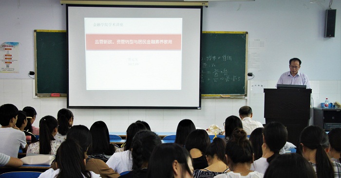 本学期金融学院继续开展教师系列讲座活动,为充分调动学生对专业知识学习的积极性,加强学生对金融相关知识的了解与认知,9月21日下午,我院于E102举办了金融学院学术讲座的第七讲《监管新政、资产转型与居民金融素养教育》,主讲人为我院贾宪军副教授,部分教师及17级投资专升本、15级投资学本科学生出席并认真听取了本次讲座。