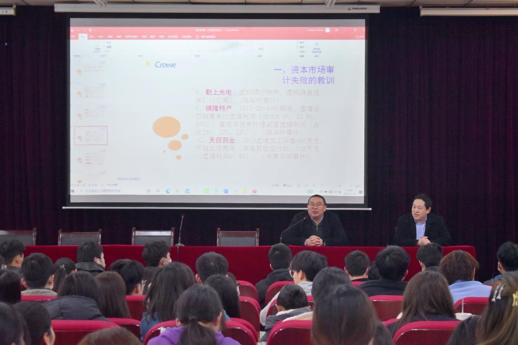 首先,张所长从我国注册会计师行业的发展开始讲述,引出此次讲授主题。随后,他例举了一些上市公司造假案例,指出当前会计和审计发展的形式严峻,并对这些资本市场审计失败的教训进行了深层次的原因分析。张所长用详细的数据和案例分析等方式进行讲解,让同学们领会到“风向导向审计是解决审计失败的重大创新方案”这一道理,同时张所长也希望同学们在日后工作中要时刻怀有“怀疑之心”,以严谨慎行的态度对待工作。在讲座的最后,黄良杰院长对本次讲座的内容进行了总结并对同学们提出期望,希望同学们不仅仅要学好专业知识,明确自己的职业规划,同时要提升自己的道德修养,遵守职业操守。
