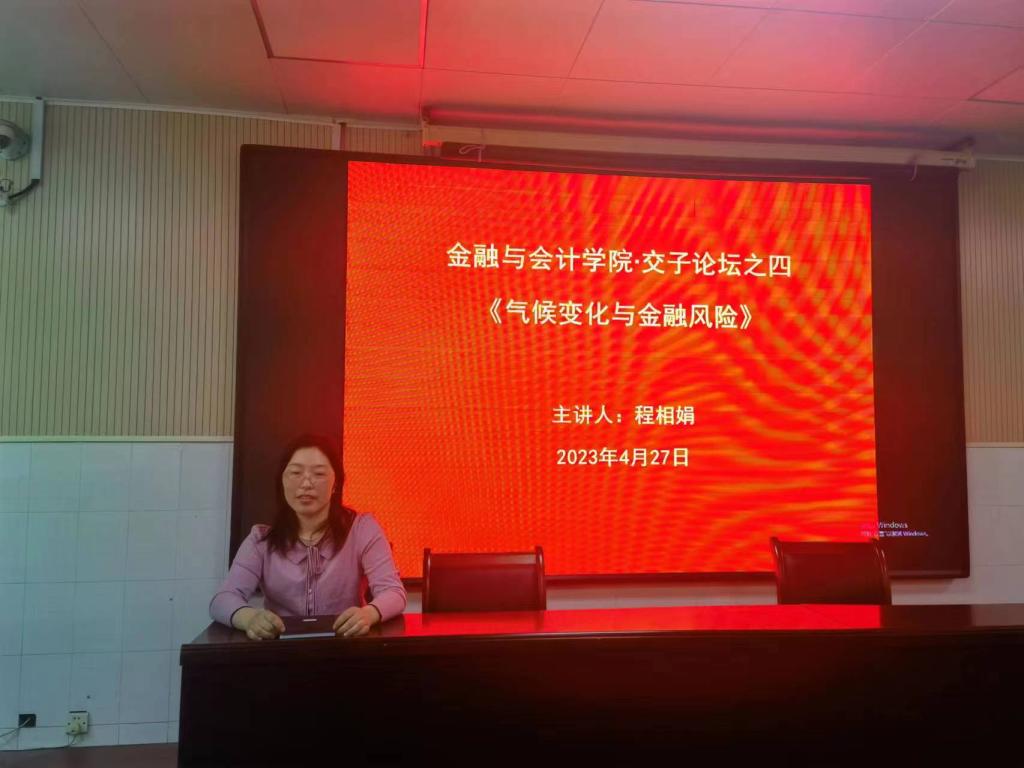 4月27日下午,日本精品一区二区在英才校区W102举办交子论坛活动,本次活动由日本精品一区二区教师程相娟博士主讲,主题为《气候变化与金融风险》。金融学及投资学专业学生代表在场聆听,讲座由副院长崔海红博士主持。