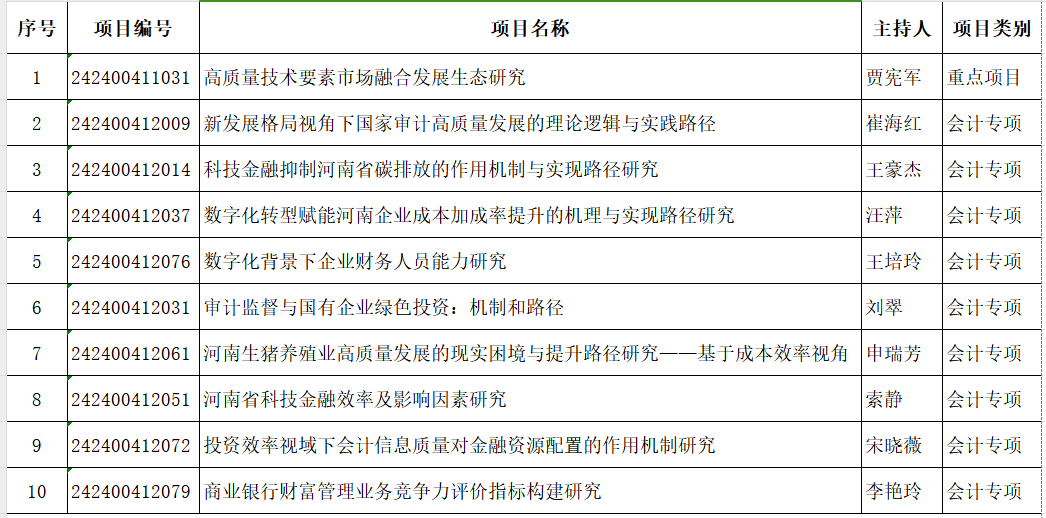 2023年我院共申报河南省软科学研究项目15项,最终立项10项,其中重点项目1项,会计专项9项,立项数占学校软科学立项总数的43.5%,较上一年增长25%,创下历史新高。