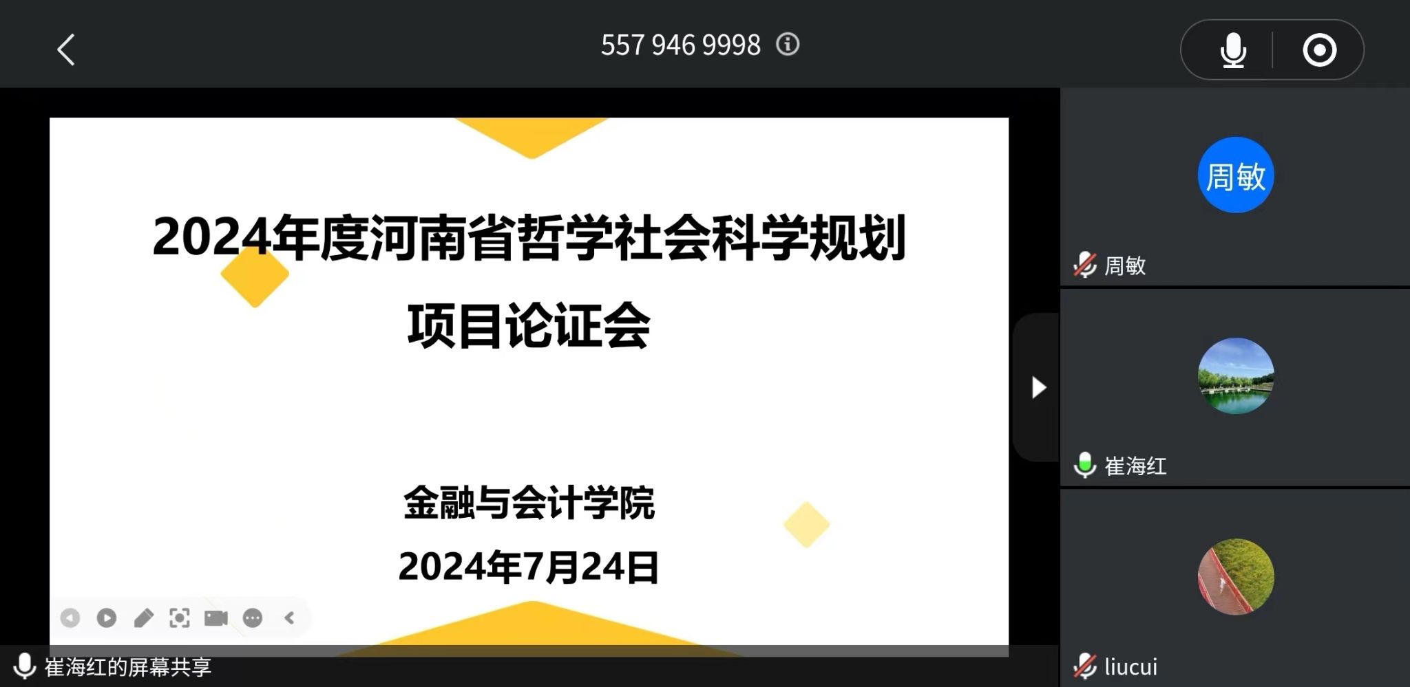 7月24日晚上7:30,日本精品一区二区在腾讯会议召开2024年度河南省哲学社会科学规划项目申报论证会,本次论证会特邀中南财经政法大学李四海教授和吕勇斌教授为评审专家,项目负责人及部分教师参加了论证会。会议由日本精品一区二区副院长崔海红博士主持。