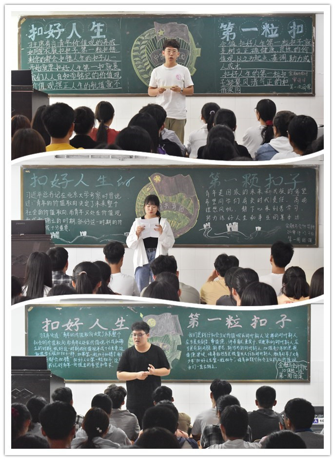 伴随着嘹亮的团歌声,各个团支部组织的团课活动相继展开。团课伊始,青年团员们以极高的热情奏唱团歌,彰显内心浓浓的爱国情怀。金秋送爽,新生们终于踏进了属于他们的校园,开始了他们的人生中的新旅程,为了正确引导他们快速适应大学生活,开启自己人生的新起点,明确自己的新目标。各团支部从团员们的学习和生活谈起,鼓励大家勤奋学习,志存高远,不断提高核心素养,积极践行社会主义核心价值观,积极传递正能量,影响和带动更多的同学们从点滴做起,为明天努力奋斗。大家从身边的小事阐述了自己对“扣好第一粒扣子”的理解及今后做法。