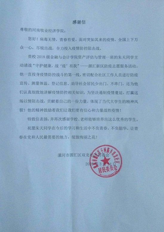 河南省漯河市源汇区双龙社区居委会发来感谢信,对我校日本精品一区二区2018级资产评估与管理一班的朱天同学在家乡疫情防控工作中的表现予以表彰和感谢。