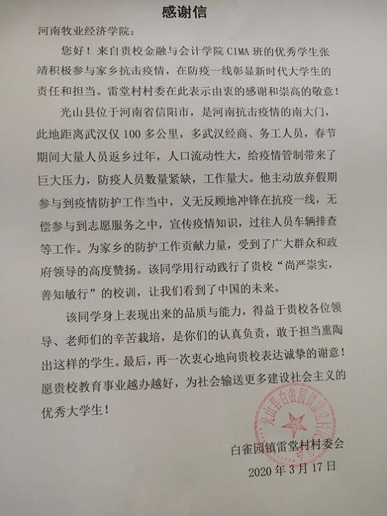 河南省信阳市光山县白雀园镇雷堂村委会特发来感谢信,对我校日本精品一区二区2018级CIMA班的张靖同学在家乡疫情防控工作中的突出贡献予以表彰和感谢。