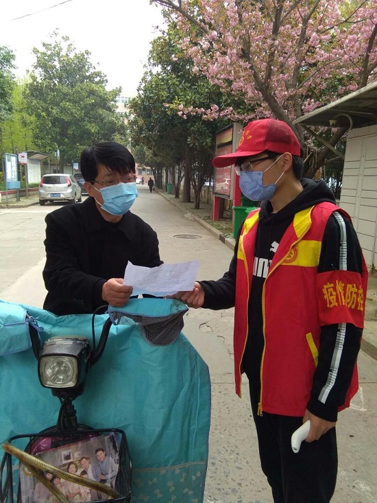 张靖同学在校兼任班级生活委员和团学会心教部部长。因为一次和疫情防控人员的接触,他看到了这些党员同志的艰辛,早出晚归,哪里有需要哪里就有他们,永远冲锋在疫情防护的第一线!他内心十分钦佩,于是在和家人沟通过后,他终于光荣的成为了他们的一员。张靖同学每天早上骑车十几公里到负责的疫情防控点站岗执勤、排查过往车辆人员、检查通行证,并宣传防范新型冠状病毒知识。