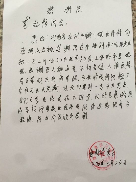 2020年伊始,“新型冠状病毒”在武汉爆发,为了防御病情蔓延,全国人民众志成城,打响了疫情防控攻坚战。我院学生李好格认为,作为一名中国公民,更是一名中国共产党党员,疫情在即,不能置身事外。听到疫情消息,她主动联系所在地党组织,请求参加疫情防控工作,经所在地党组织批准,于农历大年初二与所在地党组织和村组干部开展防疫防控值班工作,开展对村民及外来人员进行登记、劝返工作。