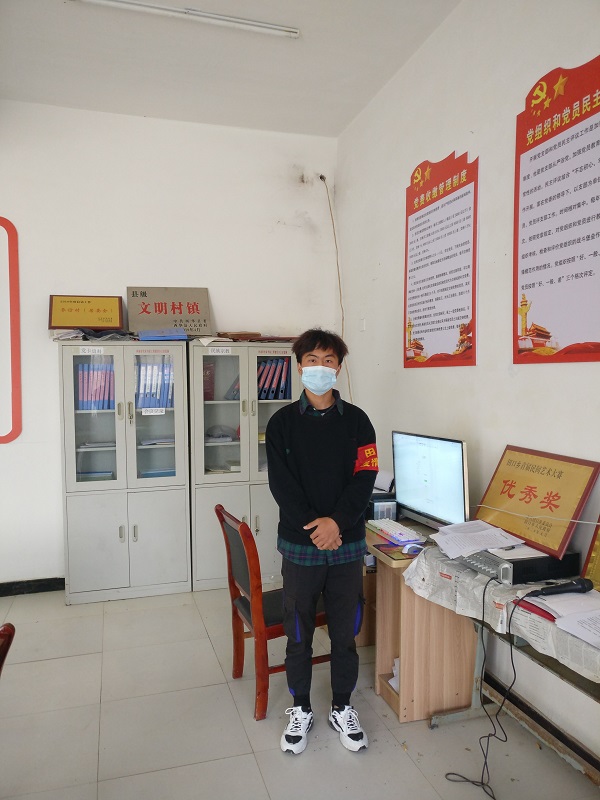 我院学生董帅兵,他对新冠疫情的记忆是从除夕的春晚开始的,再到第二天开始封村封路,之后一直通过电视新闻和网络来关注疫情的最新动态,再到观看元宵特别节目,当时他看到有这么一群守护者,他们扮演着逆行者的角色,与时间争分夺秒,极力挽救每一个需要呵护的生命。奋战在一线的他们一方面要承担着极高强度的工作,另一方面还要救治照顾着病人,而且他们随时也有被传染的风险。看到这里,他深受感动,心想要做些力所能及的事情。于是他自愿加入到志愿者服务中去,在村防疫点做志愿工作,因为只有这样他才会觉得自己和一线工作者是并肩作战的。