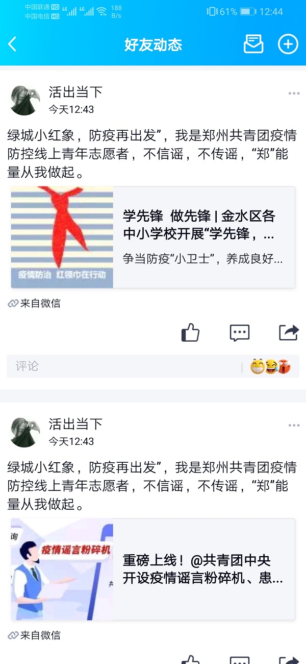 从一月二十七日报名参加线上志愿者活动开始至今,她每天都会发布一到两条有关动态,来进行宣传工作,现在累计已经发布二十一条动态,作为志愿者,对此工作,不敢有丝毫懈怠,适合保持作为志愿者的初心。不忘初心,砥砺前行。