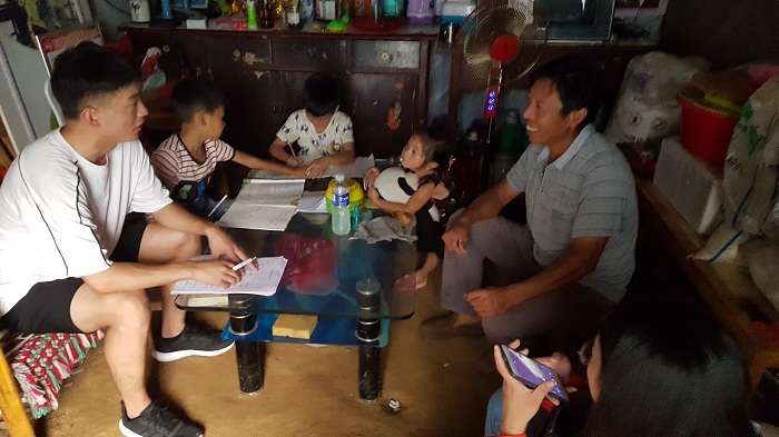 随后,服务队一行人来到隔壁一户人家,一进屋就看到两个孩子在写作业,一个孩子在旁边玩耍,家主今年34岁,初中毕业,家庭收入来源为进城务工,人均年收入5000,家中7口人,三个孩子,两位老人,因为老人伤病,住院医疗花费家中大量积蓄,因病致贫,希望获得就业方面的帮助与支持。志愿者们在辅导孩子作业后,又倾听孩子们在学习、生活中遇到的困难和感想,志愿者鼓励孩子们要勇敢的克服困难,努力学习,只要坚定信心,内心的愿望总会到来。