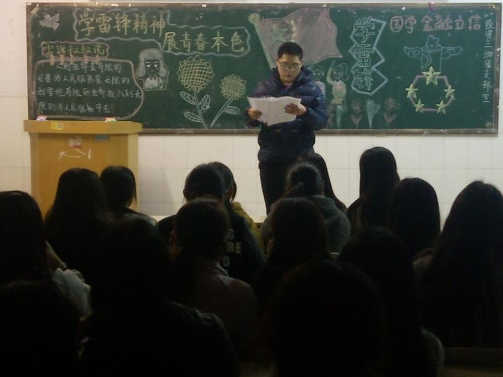 各支部在团支书带领下,共同回顾了雷锋同志的光辉事迹,让同学们在接受雷锋精神熏陶的同时,帮助同学们重温那段感人至深的难忘岁月。保险班同学们同唱《学习雷锋好榜样》,调动了全场气氛。同学们纷纷上台,或讲述雷锋生平小故事,或朗诵收集到的关于缅怀、纪念雷锋的诗歌等,同学们在怀念的氛围中,积极讨论和发言,每个人都融入其中,通过聆听、观看、发言等不同地途径得到收获。