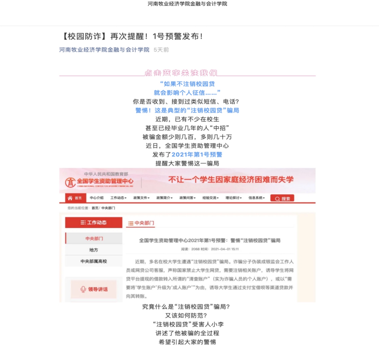宣讲活动中,老师通过诚信美德事例引入资助诚信教育主题,向学生下发有关征信知识、金融知识的宣传页,教育学生珍爱信用,理性借贷,引导学生树立正确的消费观、荣辱观、价值观。通过播放题为《助学贷款失信警示》的宣传片,向学生介绍失信案例,引导学生及时查询自己的信用报告,培养良好信用习惯。此外,本院微信公众号通过推送题为《【校园防诈】再次提醒!1号预警发布!》的文章,向学生强调征信的重要性,明确“非法校园贷”对个人信用的危害,远离网络贷款,提高警惕,谨防受骗。