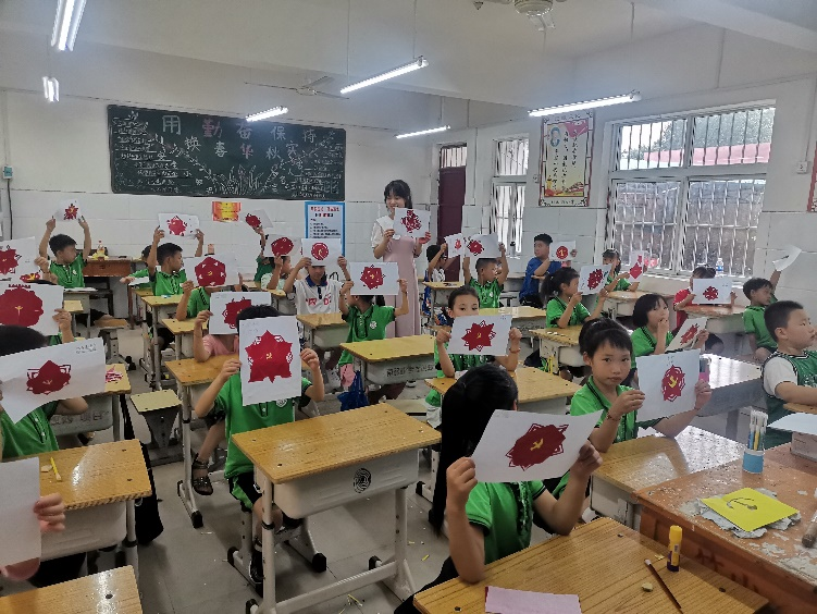 15:00上美术课啦!2021年是中国共产党建党的第一百周年,小芽老师生动有趣讲述了党徽的构建过程。在课堂中,以激发孩子们的想象力为主线,汇集了不同的孩子的不同的想法,展示着他们各自的个性特色。