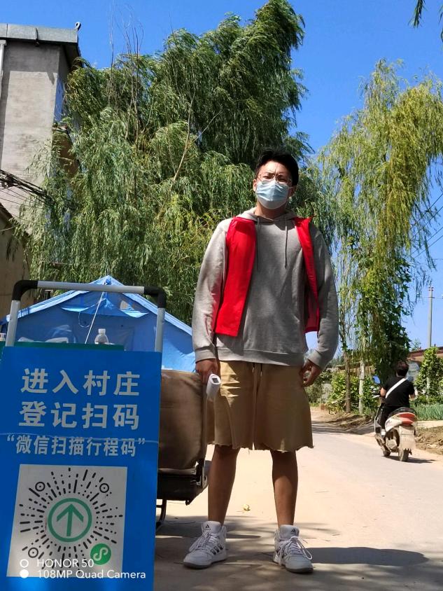作为当代青年大学生,赵凯庆同学深知自己的责任和义务,在保护自己的同时,尽己所能,去服务他人。在疫情防控期间,积极响应号召,参与疫情防控志愿服务活动,以实际行动践行初心使命。在8月11日至8月27日期间,他主要负责测量进村人员的体温,查看行程码、健康码及核算证明,坚守岗位为他人带去帮助。