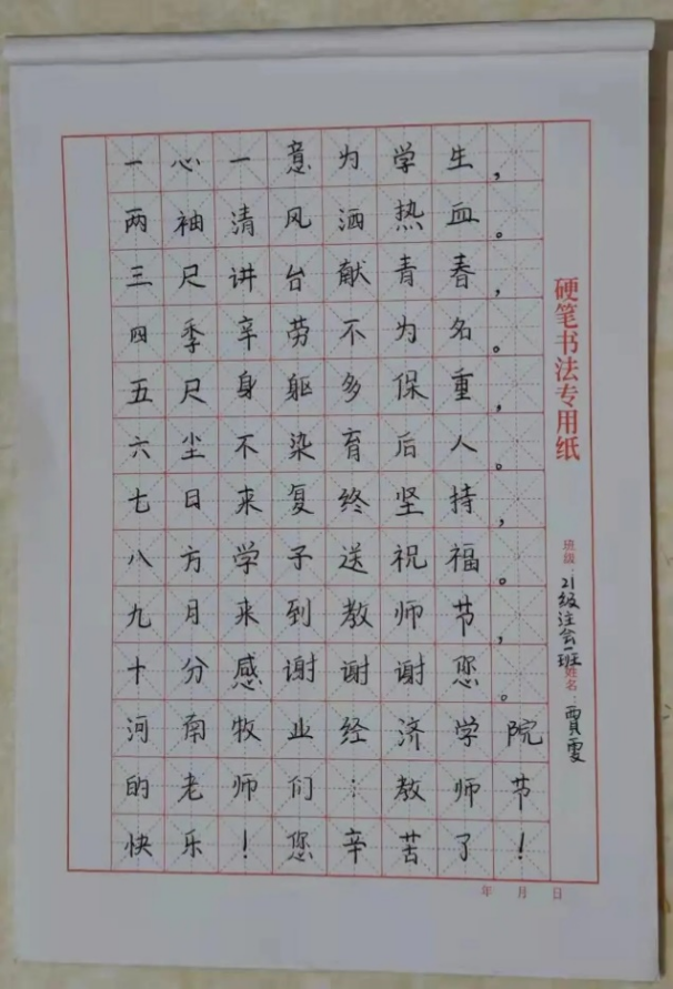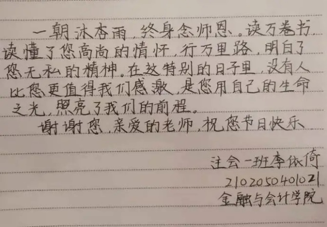 不计辛劳求奉献,三尺讲台夜灯长明,赤诚之心不一般,桃李天下香满人间,英才济济笑开颜。很荣幸能够成为您的学生,同时也像家人一样一起度过四年。虽然被疫情所隔开迟迟无法见面,但是我们的心意是无法阻挡的。希望在以后的日子里我们共同点亮未来的“光”,共同走向辉煌!祝老师教师节快乐!