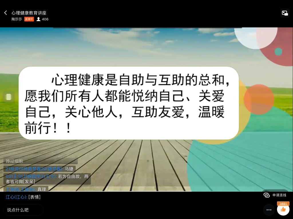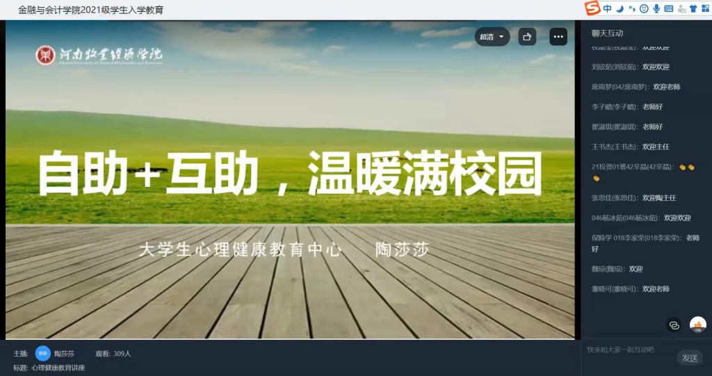 为促进我院心理健康教育建设,帮助新生更好地适应大学生活,树立更健康积极地心态,日本精品一区二区于9月15日晚19:00在线上开展新生入学教育“寻找心灵的龙猫”心理健康项目之专题讲座。本次讲座由大学生心理健康教育中心副主任陶莎莎主讲、陈阳老师主持,全体2021级新生参加。