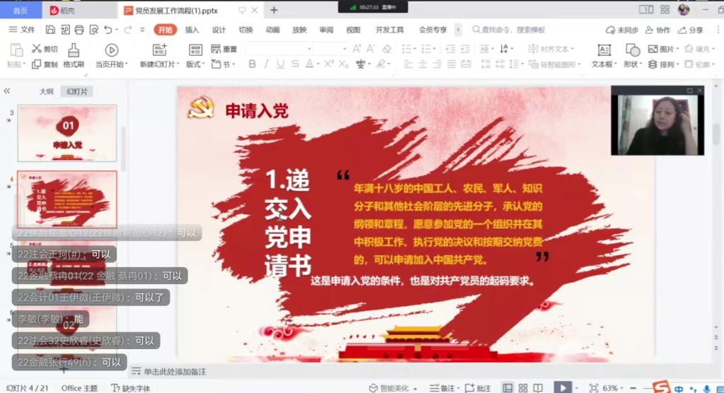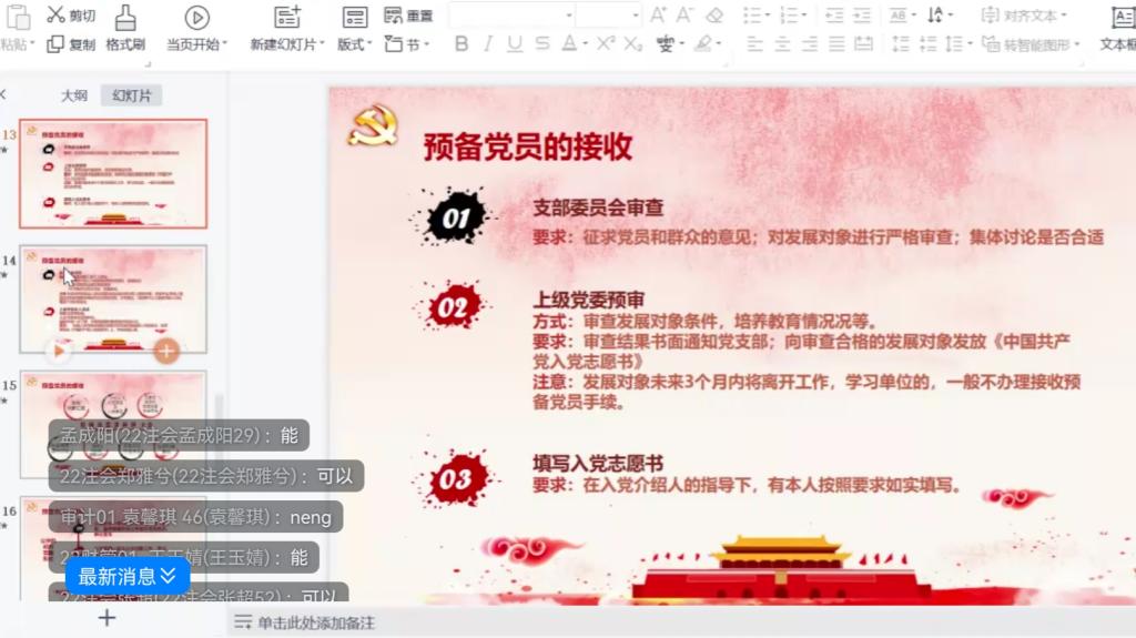 首先,葛老师详细为同学们介绍了从递交入党申请书到成为一名正式党员的全过程,主要包括:申请入党、入党积极分子的确定和培养教育、发展对象的确定和考察、预备党员的接收、预备党员的教育考察和转正五大内容。接着,葛老师与新同学们进行线上互动,热心的解答了22级新生对入党流程的种种疑问,提醒了同学们在入党过程中需要注意的事项,让大家对党员发展的流程以及各项制度有了更深的了解。最后,葛老师强调了入党流程的严谨性与规范性,并且希望同学们在即将到来的大学生活中,能够不忘初心,服务集体,能严格要求自己,充实自己,早日加入中国共产党。