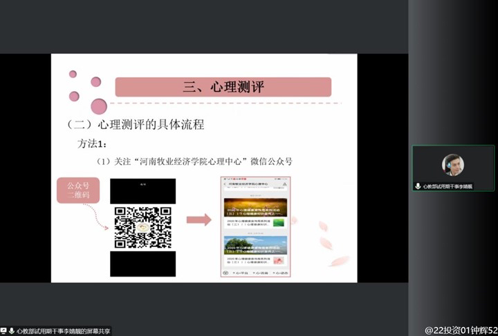 随后心教部干事李婧靓讲解了心理测评的目的以及心理测评的两种具体方法,从而帮助各班心理委员更好的反映班级同学的心理健康状态,推进各班心理健康教育工作。
